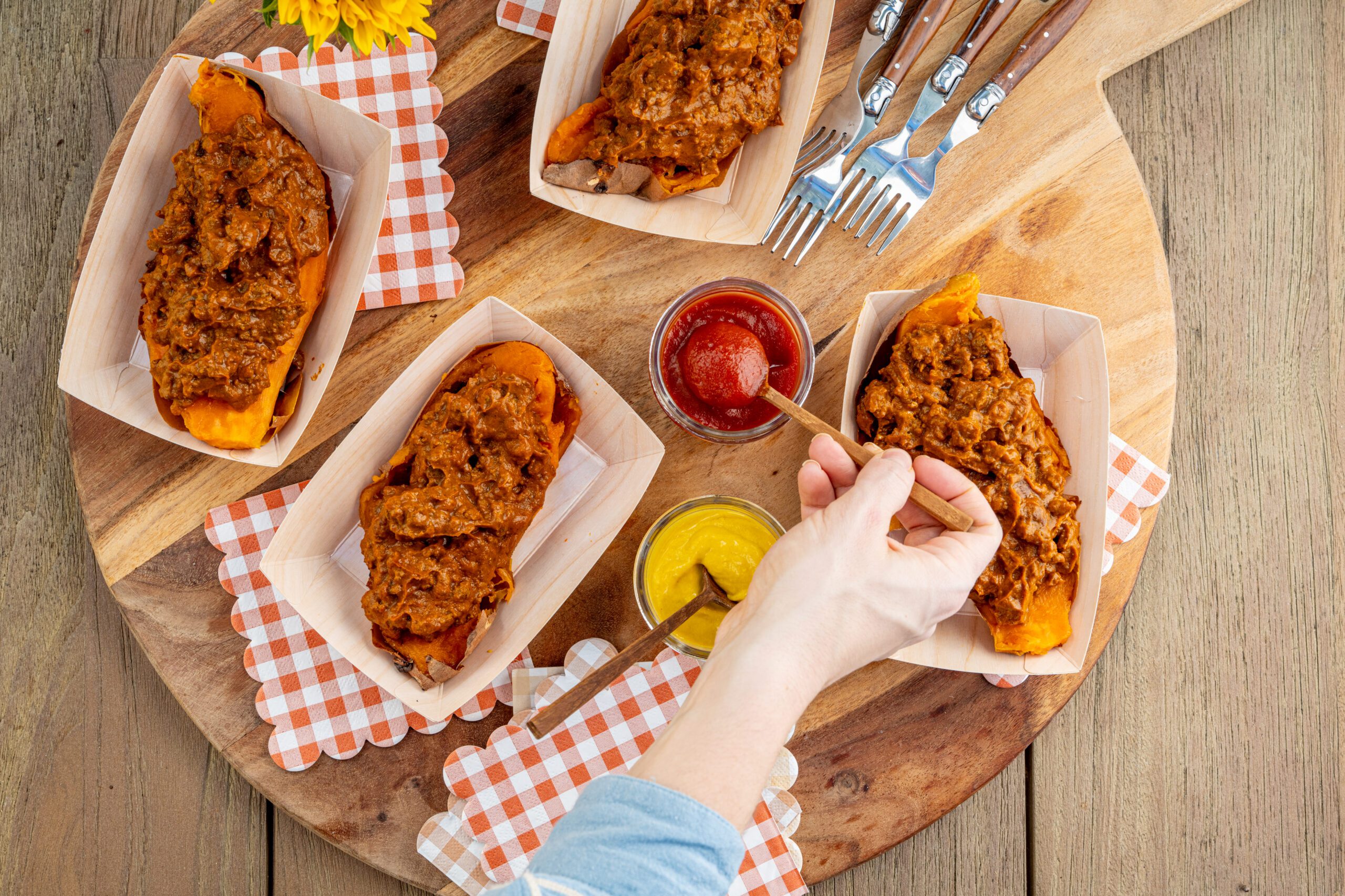 6. Cut sweet potatoes in half and scoop out a portion of the middle. Fill with sloppy joe meat, knowing some might spill over.
